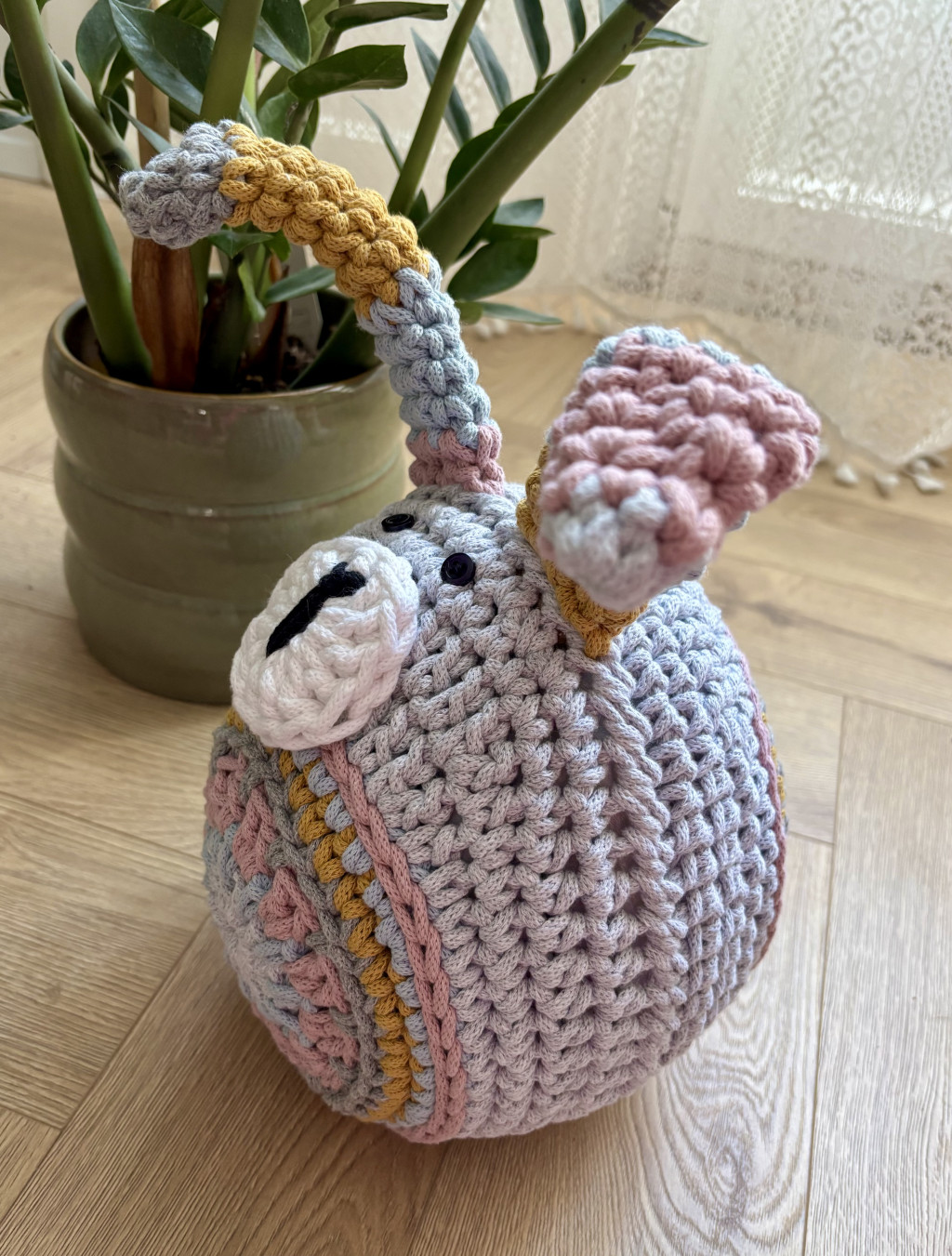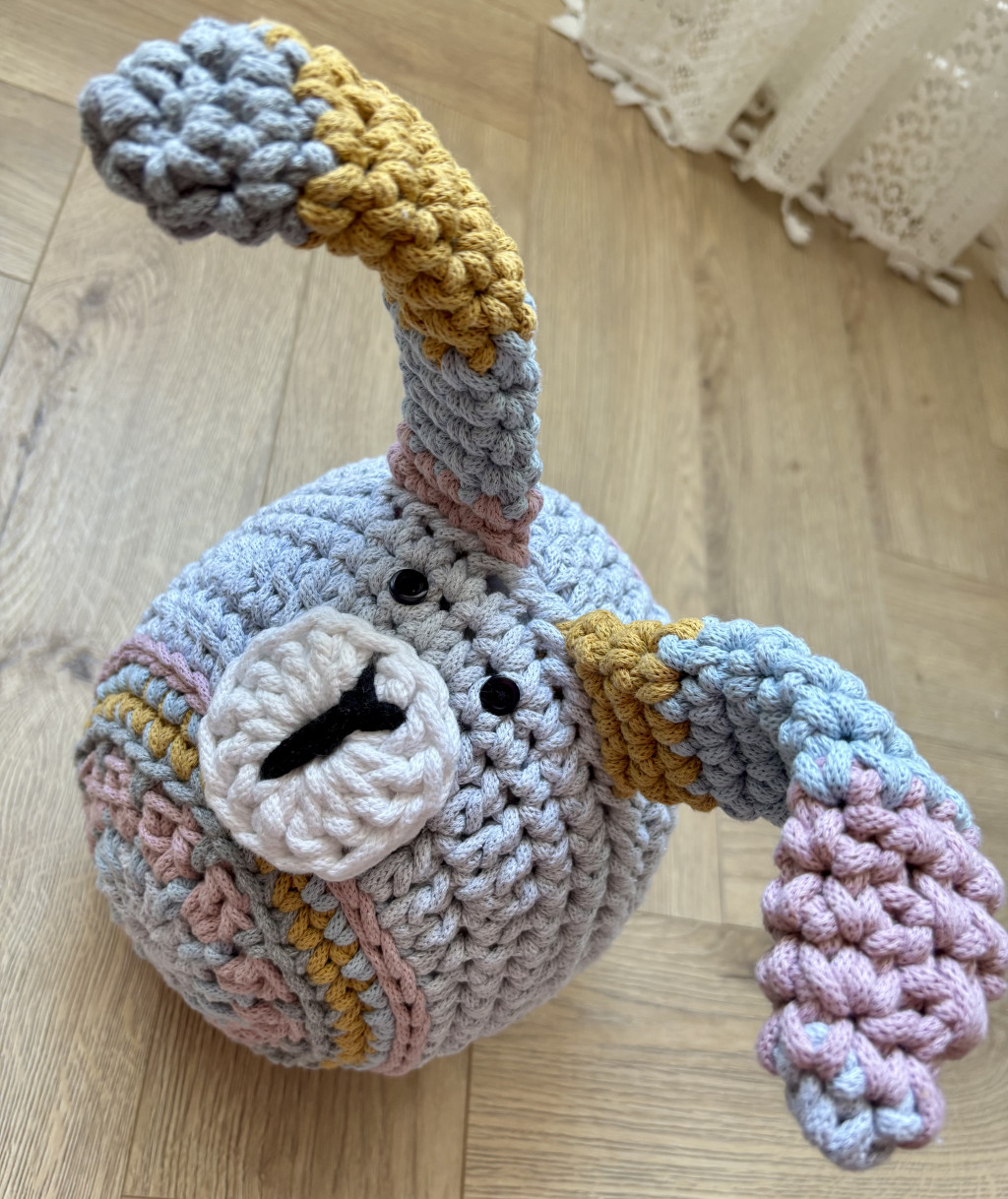 Horgolótű: 6-7 mm, attól függően, hogy mennyire horgolsz szorosan vagy lazán